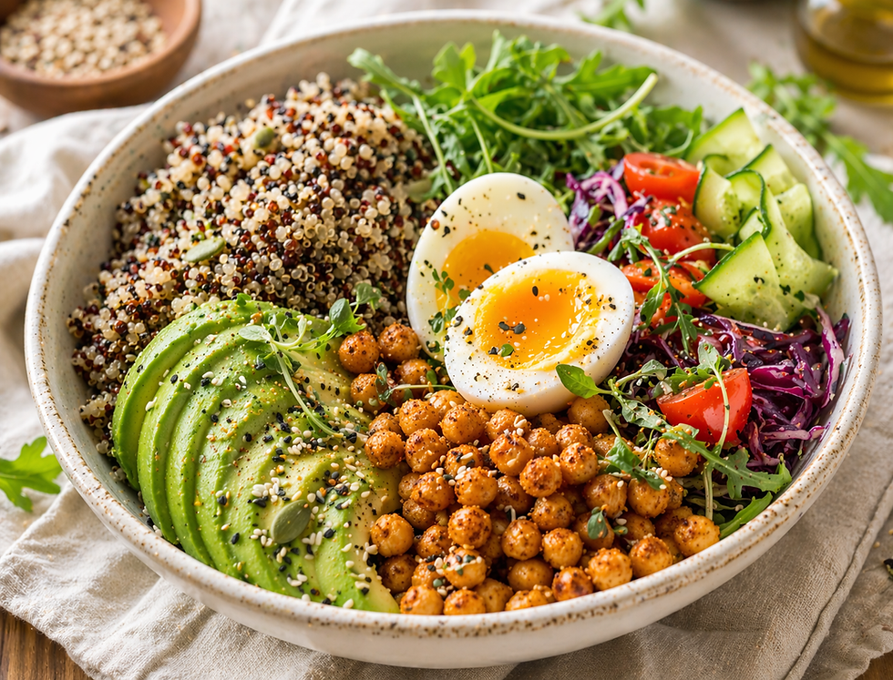 Buddha bowl quinoa, pois chiches, avocat & œuf